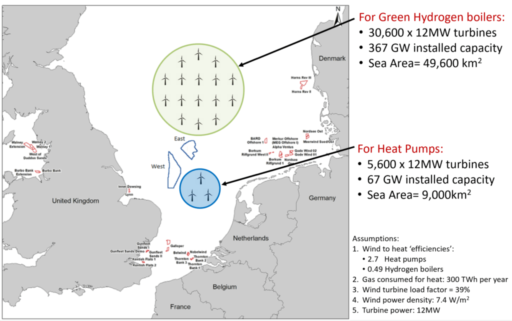 For comparison, all existing offshore wind installations in the North Sea are plotted in the small red polygons on figure 2. There are currently 2,300 offshore wind turbines in UK waters, with an installed capacity of 11GW [2]. So generating sufficient green hydrogen for heating UK buildings would require this to be increased by a factor of nearly 33. Some of the sea areas under consideration for future expansion in ‘Round 3’ of the UK’s offshore wind development at Dogger Bank are the blue polygons labelled ‘East’ and ‘West’ in figure 2. In total the Round 3 projects amount to another 18GW, of planned capacity which will take the total to about 30GW. This is less than half that required to decarbonise the UK’s heat by the heat pump route.