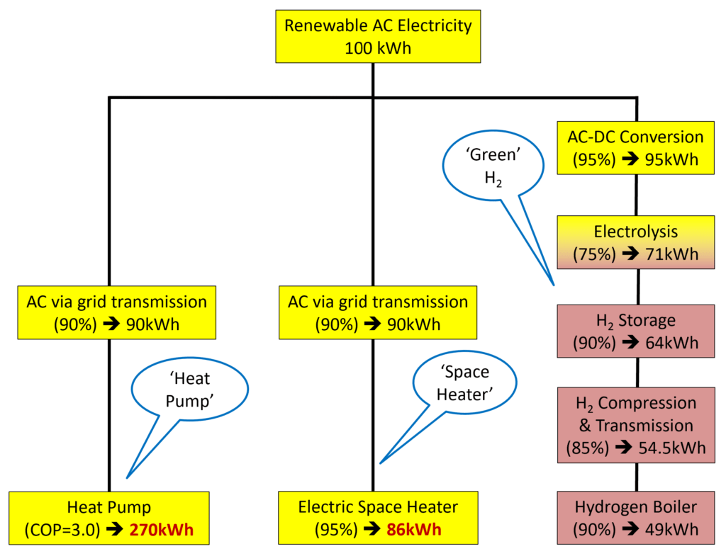 Conclusions: An electric space heater will deliver nearly 90% more heat per kWh of input electricity than a Green Hydrogen boiler. A heat pump would deliver (270/49) = 5.5 times more heat from the same amount of electricity as the Green Hydrogen route.